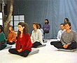 sentado en una posición relajada con los ojos cerrados y entonando